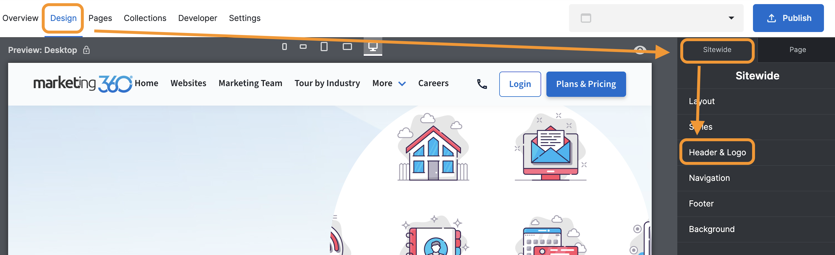 The Header & Logo settings in the Design panel lets you manage your website's logo, favicon, and edit the spacing and border of your website's Header. These are Sitewide settings, so any changes you make here will apply to every page on your website. ...