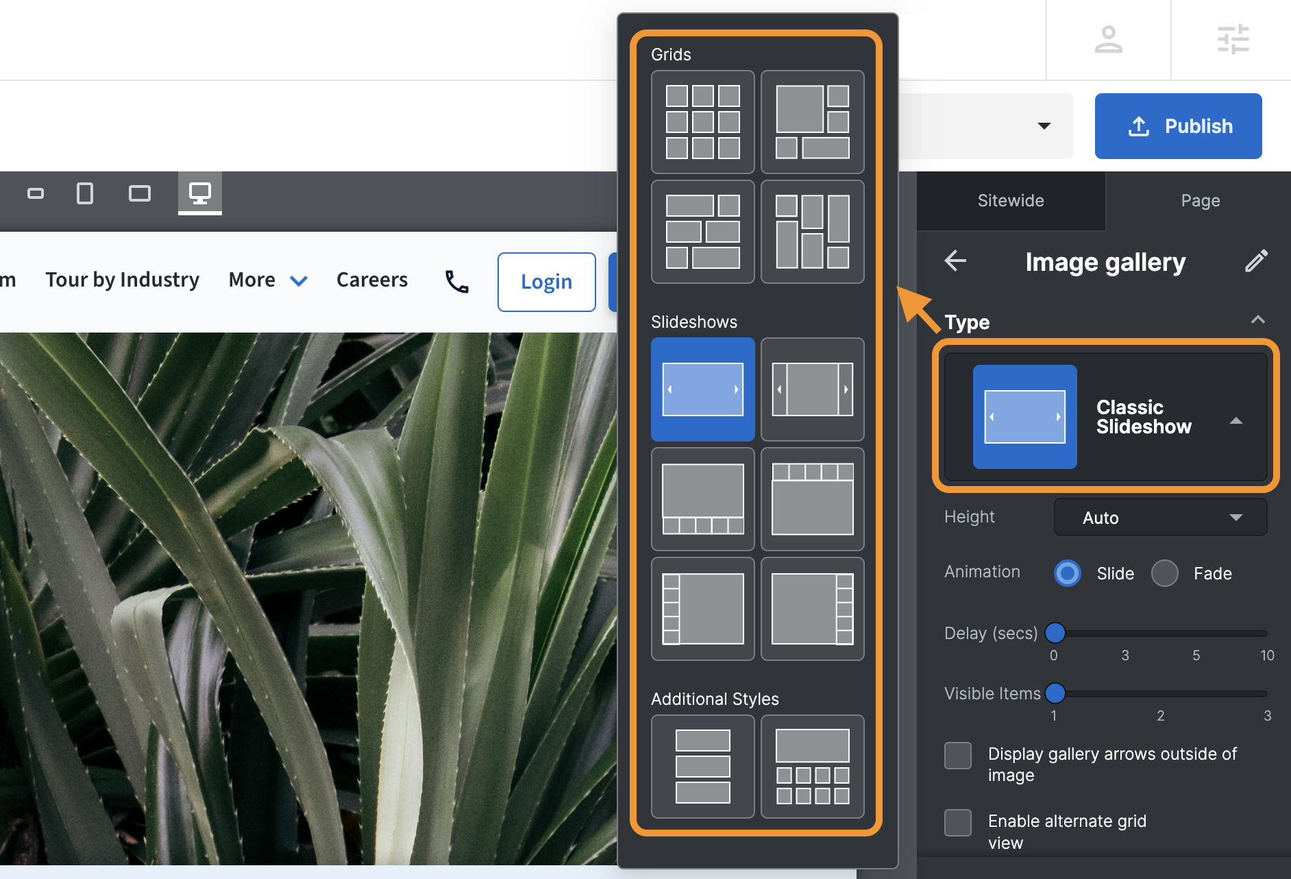 Design: To change the layout of your gallery, click Design this page at the top of the screen. Click on an image in the gallery, then use the drop-down menu under Type to select a new layout, such as a slideshow or grid. You can also adjust other design options from the sidebar. Click Save when you're finished.