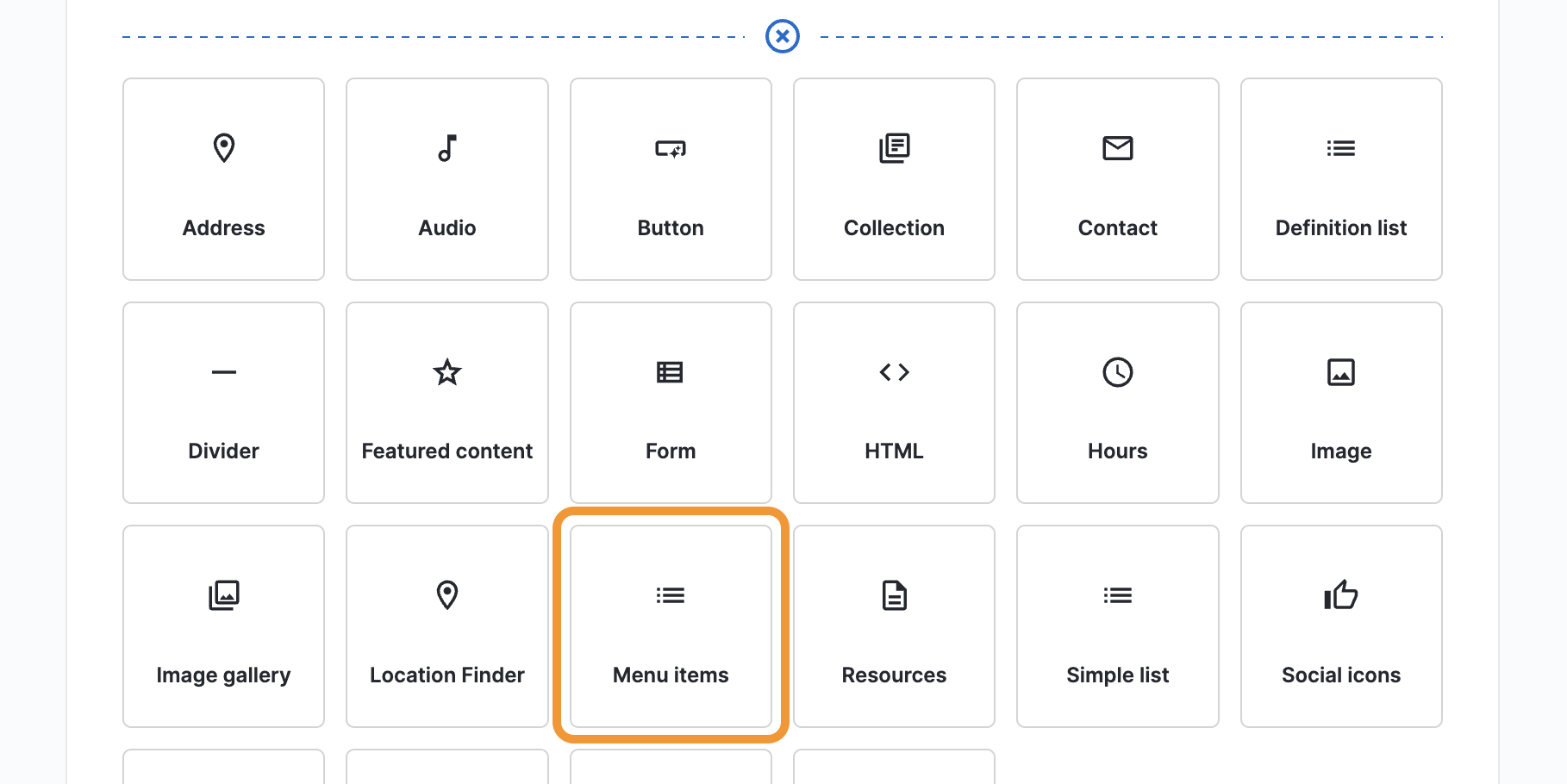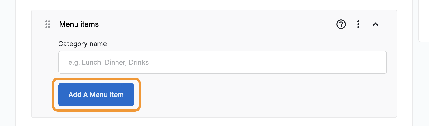 The Menu page comes with a pre-built Menu items content block. Click Add a Menu Item to begin adding your food or drink items.