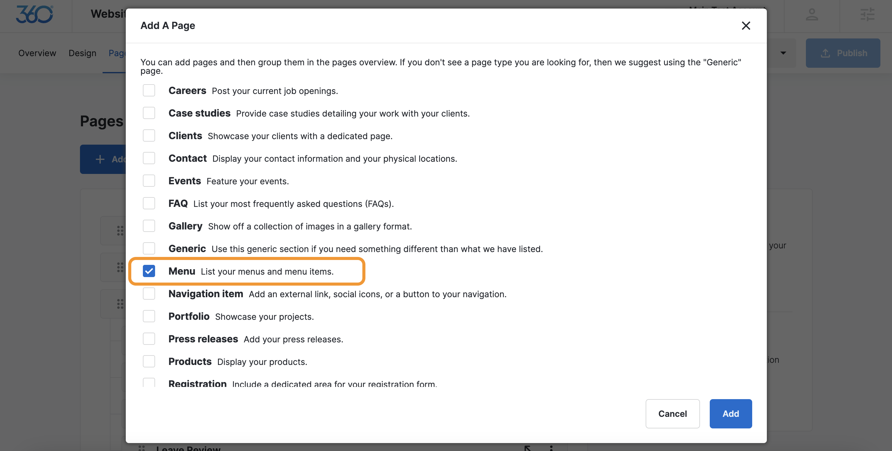 In the Pages panel in Websites 360®, open the page where you want to add the menu.