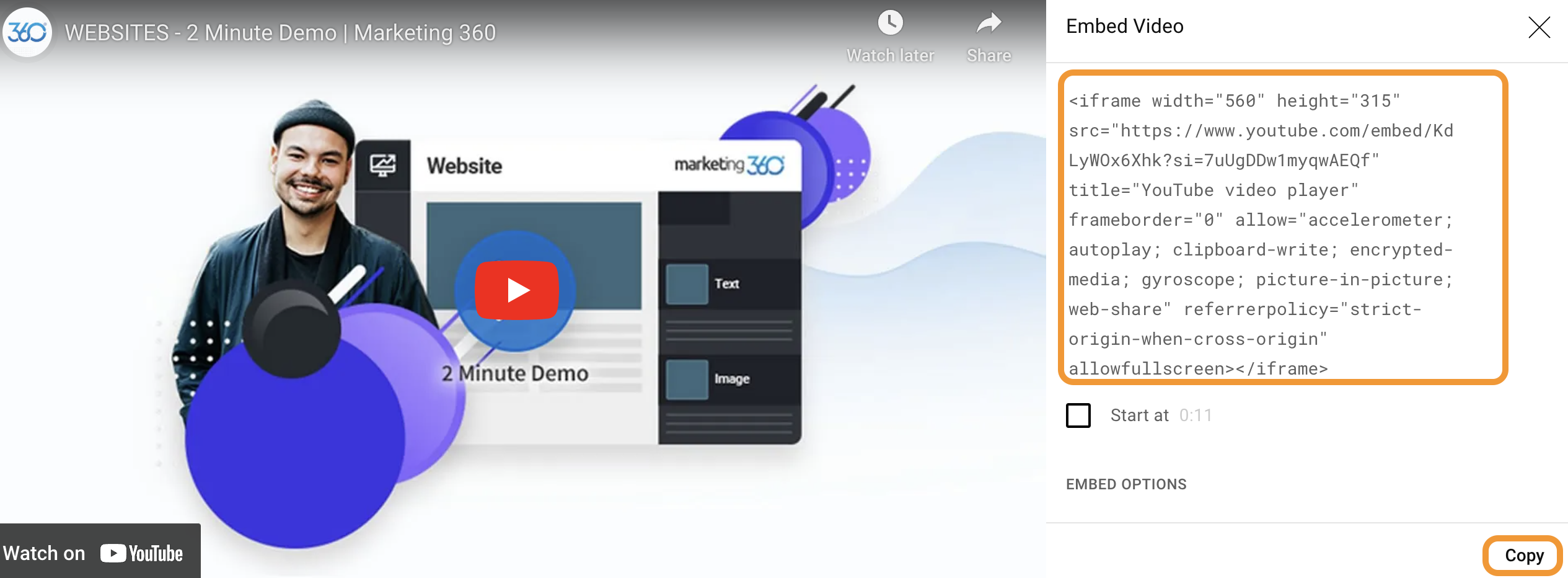 In the pop-up window, click Embed, then copy the embed code.