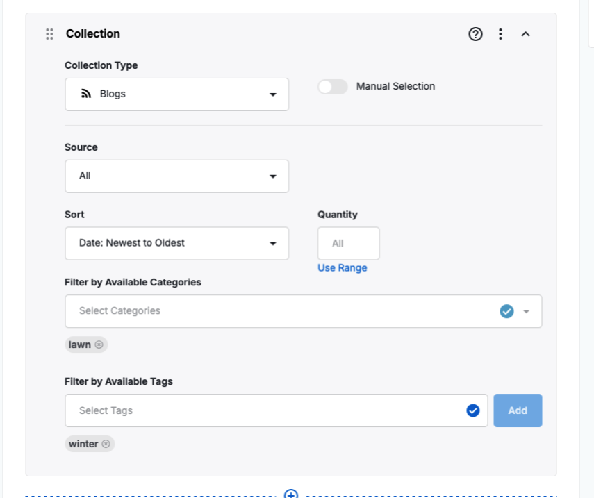 For example, this Collections Blog would only show blogs in the "Lawn" Category with the "Winter" tag: