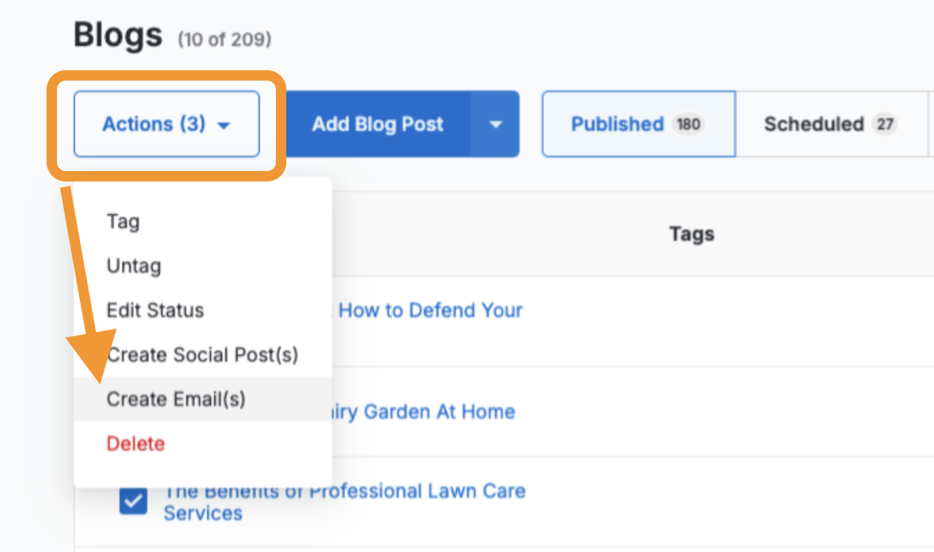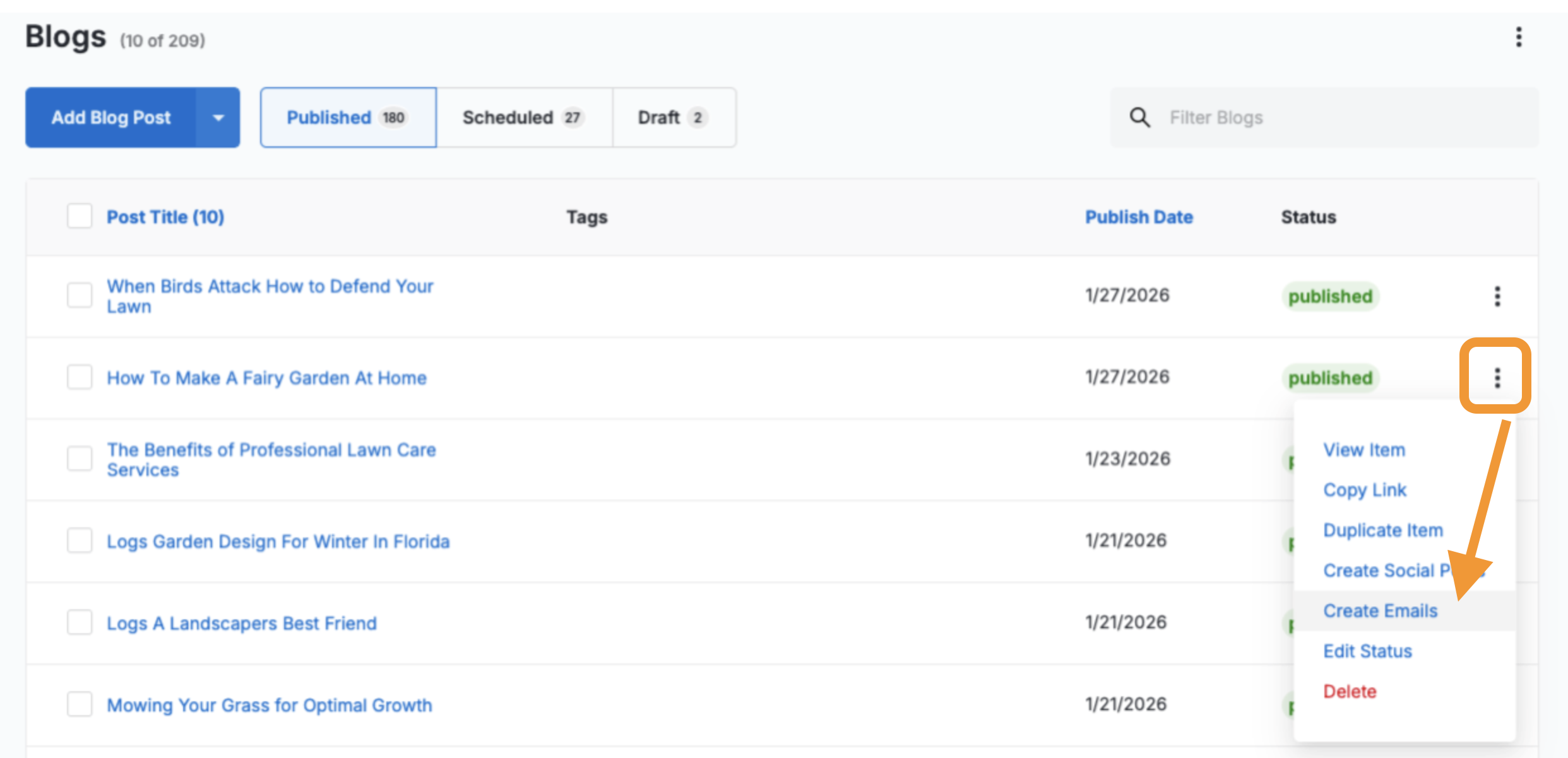 You can create emails for Published and Scheduled blogs only (not Drafts).