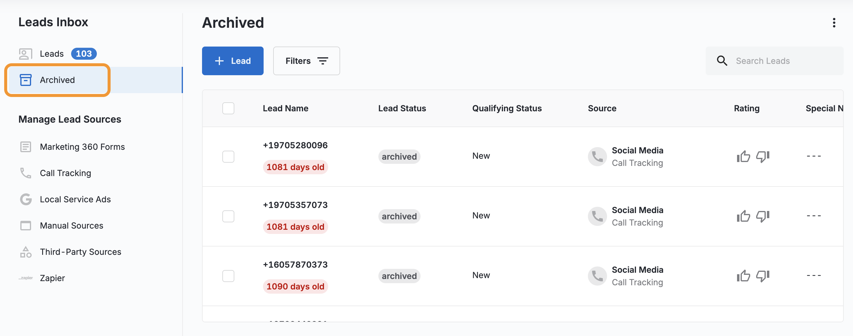 The Archived page is where you can view all your Archived leads. Archiving a lead is a great way to save that lead’s information for future reference if they are not likely to convert right away.