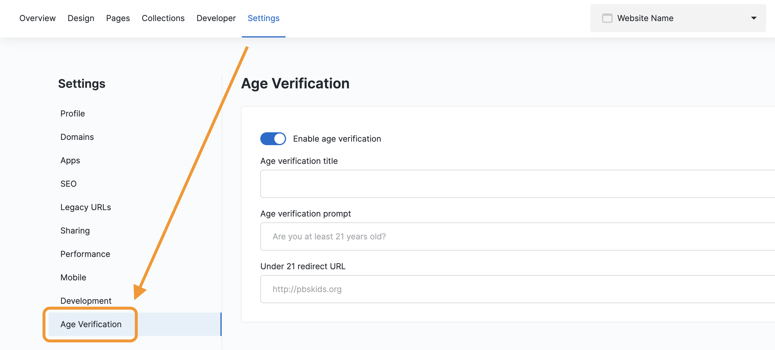 - Turn on the toggle switch labeled Enable age verification.