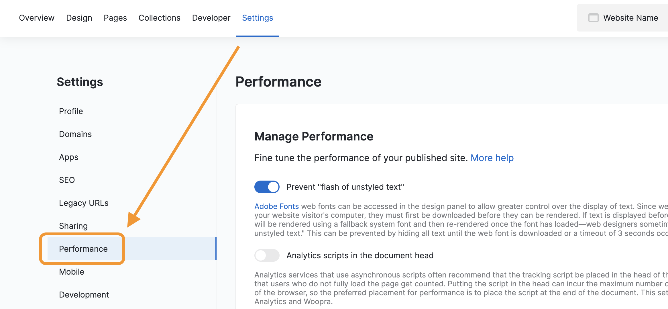 You can fine-tune some performance settings of your website to help the site load faster, or for analytics scripts to load more quickly.