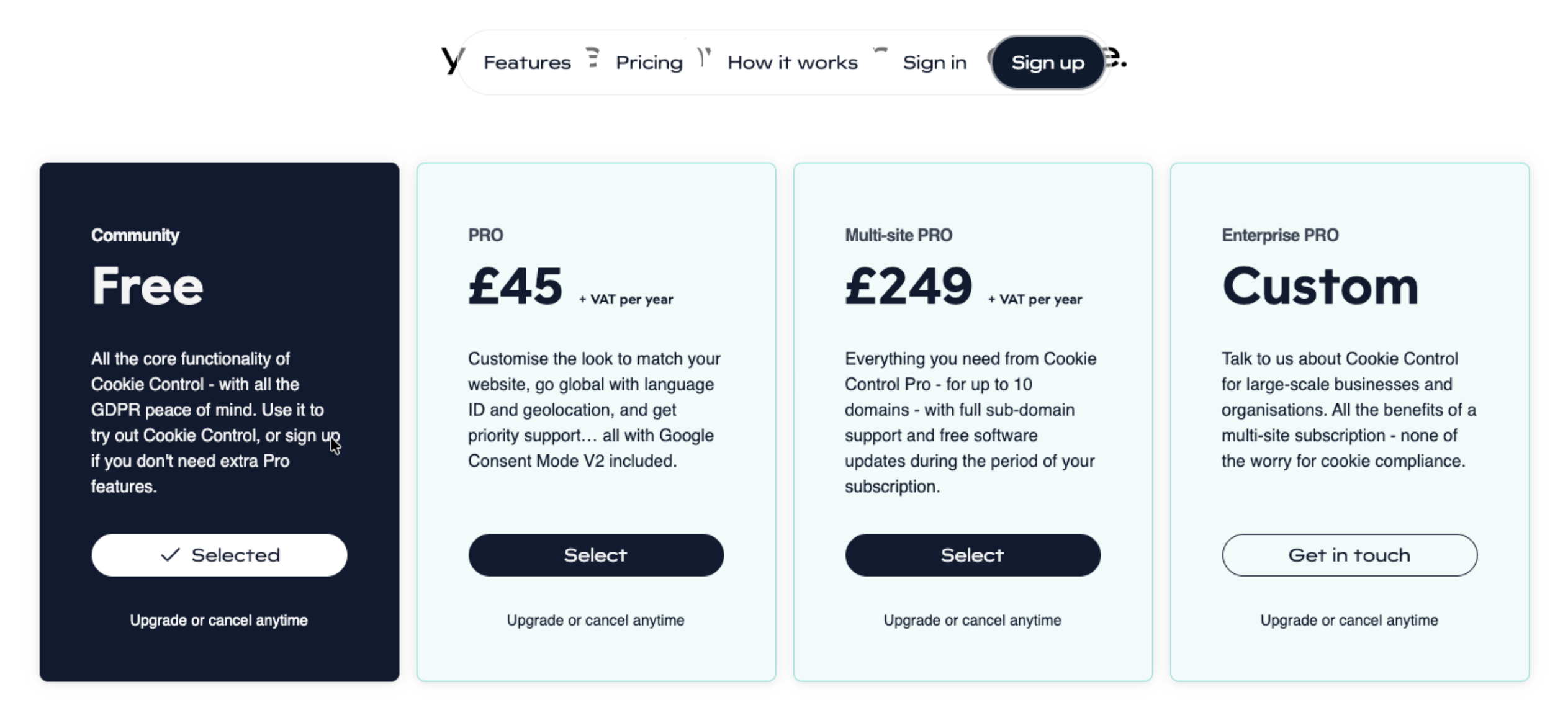 Go to cookiecontrol.com and click Sign Up at the top of the page.