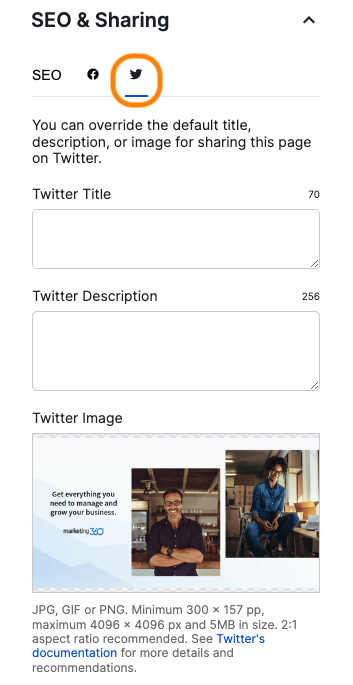 Twitter title: Unless you customize this field, your SEO page title is used. Twitter description: Without an SEO description customized, the first block on your page containing text will be used here. Twitter image: By default, the site logo image is first to be chosen if you do not upload an image here. JPG, GIF or PNG. Minimum 300 x 157 px, maximum 4096 x 4096 px and 5MB in size. 2:1 aspect ratio recommended. See X's documentation for more details and recommendations. |
